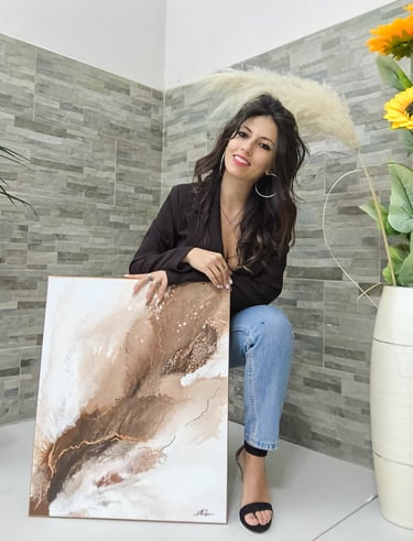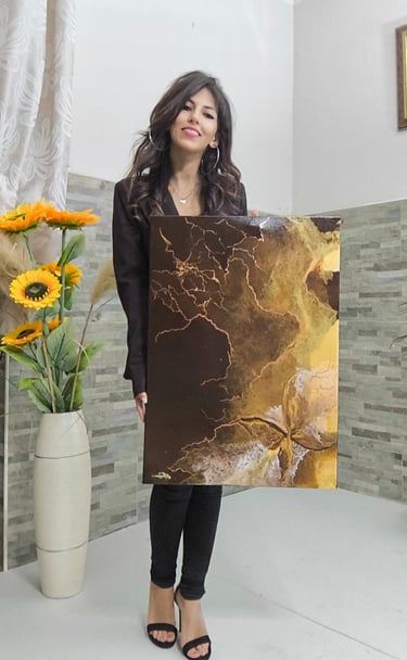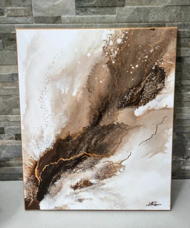Questa opera su tela 50x60 cm fa parte della collezione Whispers of Shape. Attraverso l'uso dell'acrilico fluido, le tonalità profonde del marrone e del beige, arricchite da venature in foglia oro, non rappresentano un soggetto statico, ma un flusso ricco e avvolgente. Le forme si fondono e si dissolvono in un movimento continuo.