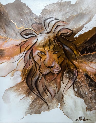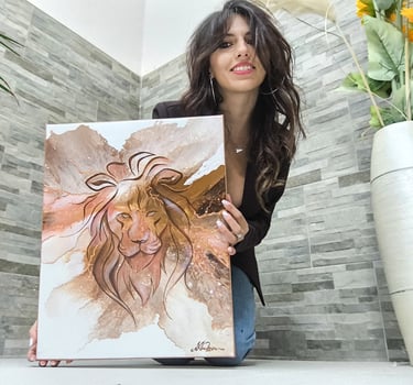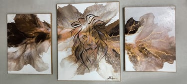 In questo trittico, composto da una tela centrale 40x50 cm e due tele laterali 30x40 cm, l'energia del leone si manifesta non attraverso la forma statica, ma attraverso il flusso dell'acrilico fluido. Le linee in foglia oro creano connessioni preziose e inafferrabili.