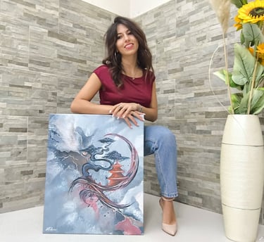In questa tela 50x60 cm, l'acrilico fluido e la foglia oro non celebrano solo il movimento, ma testimoniano la fragilità della bellezza. L'architettura sacra del tempio e la natura del bonsai sembrano sfaldarsi nel colore, rappresentando una cultura e un’arte che, nel loro eterno divenire, rischiano di scomparire. Ogni linea dorata è un ultimo, prezioso riflesso di una sapienza antica che si dissolve nell'oblio del tempo, invitando l'osservatore a riflettere su ciò che stiamo perdendo.