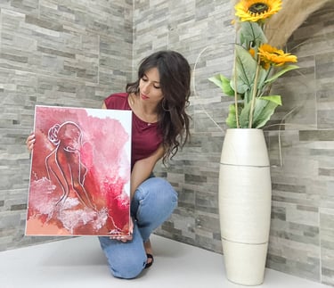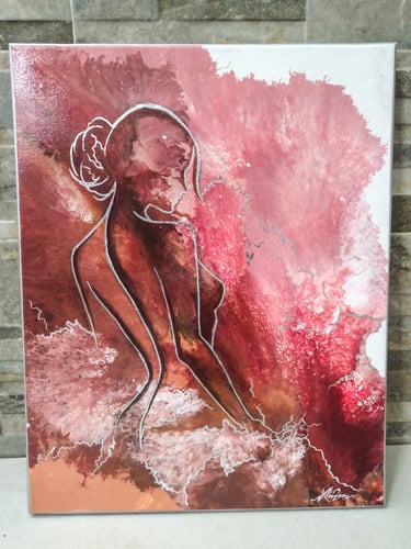 Questa tela, dalle dimensioni di 40x50 cm, fa parte della collezione Whispers of Shape ed è una celebrazione visiva della bellezza e della profonda importanza della donna. I tratti sottili in foglia argento non sono semplici contorni, ma connessioni invisibili che simboleggiano l'energia vitale e la sacralità del principio femminile, un flusso ininterrotto di creazione e mutamento che è parte essenziale dell'infinito flusso della vita.