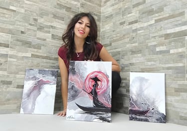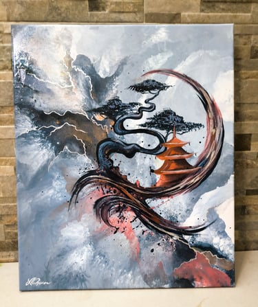 Un accattivante trittico contemporaneo che fonde l'astrazione con il simbolismo orientale. L'opera raffigura la dea del sole, Amaterasu, mentre attraversa una tempesta elettrica in un solenne silenzio. Il contrasto tra il dinamismo dei fulmini (realizzati con tecnica fluida) e l'immobilità della silhouette centrale crea un equilibrio visivo magnetico.